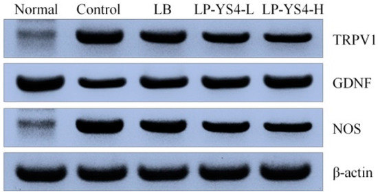 The TRPV1 and NOS mRNA expressions of mice in control group were highest, but GDNF expression was lowest (Figure 6 and Table 10 and Table 11). LP-YS4-H could reduce the TRPV1 and NOS expressions and raise GDNF expression as compared to the control group, and make these expressions closer to the normal group.
