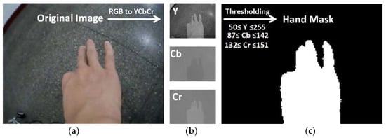33]. Then, for each pixel, if all three of its color channels are between the corresponding lower and upper thresholds, this pixel belongs to the hand and is marked as white. Otherwise, it is marked as black.