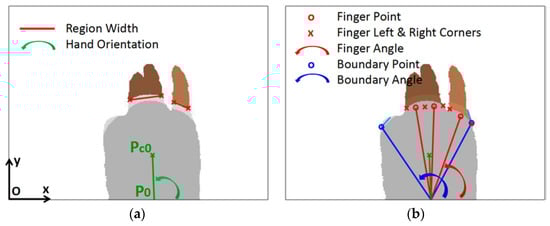 Before the next step, left and right boundary points are detected, which indicate a possible angle range of five fingers, as shown in blue circles in