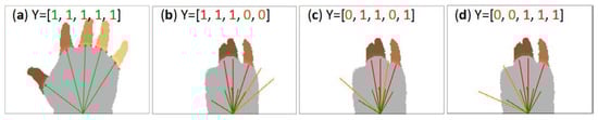 Figure 6b–d, where b,c are false predictions, and d is correct. Red lines indicate the detected fingers, and the oranges lines are the predicted positions of the two unknown fingers.