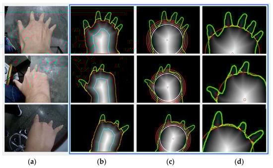 Figure 4a, where whiter pixels represent a further distance to the boundary. The radius of the hand’s maximum inner circle