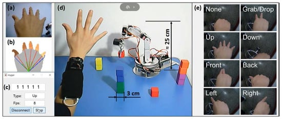 35] (pp. 180–186) to drive the gripper towards the direction of the front, back, up, and down. The linear speed was set at a moderate level of 0.04 m/s so that the user could give the right command in time. Moreover, the left and right rotation of the body of the robot arm was achieved by the bottom servo motor at an angular velocity of 0.2 rad/s. Moreover, since the frame rate of the video might drop to 8 frames per second under poor lighting conditions, we set the frame rate and control frequency as 8 per second, which was still fast enough for real-time control.