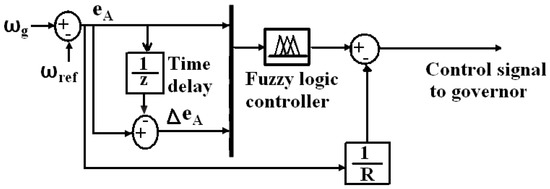 The basic construction of the governor control approach designed for the conventional generators is presented in Figure 2. The deviation of rotor speed of each conventional generator and its variation during a sampled time are considered as two input signals for the fuzzy controller, while its output is the control signal to adjust the governor set point of each generator. The governor has non-linear characteristics, but can be modeled with a first-order lag transfer function where the time constant is 0.08 s. Also, the value of R is 2.4 Hz/pu.Mw. Fuzzy membership functions for the input and output patterns of the proposed FLC technique are addressed in Figure 3. Also, Table 1 shows the associated control rules. The membership functions corresponding to the input and output variables are set as Negative Large (NL), Negative Medium2 (NM2), Negative Medium1 (NM1), Negative Small (NS), Zero (Z), Positive Small (PS), Positive Medium1 (PM1), Positive Medium2 (PM2), and Positive Large (PL). They have been arranged based on triangular membership functions. The antecedent part of each IF–THEN rule is created using the And function. Also, Mamdani fuzzy interference system is used in this control approach. Finally, resultant fuzzy subsets representing the controller output are converted to the crisp values. Unlike the traditional control theorems, which are based on the linearized models of the controlled system, the fuzzy control scheme tries to build the proposed controller in a direct way based on long-term experience, knowledge of domain operators, and measurements. Then, the GA is used to tune the input and output membership function parameters of the proposed fuzzy controller to improve its performance using integral absolute error criteria (IAE) utilizing the MATLAB® (Release 2016a, The MathWorks, Inc., Natick, MA, USA) environment based on the following equation: