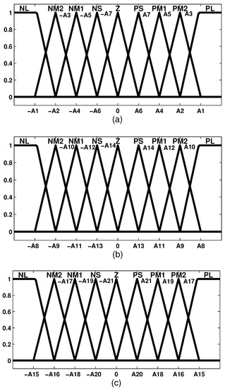 (a) Fuzzy membership functions for the governor controller’s first input; (b) Fuzzy membership functions for the governor controller’s second input; (c) Fuzzy membership functions for the governor controller’s output. NL: Negative Large; NM2: Negative Medium2; NM1: Negative Medium1; NS: Negative Small; Z: Zero; PS: Positive Small; PM1: Positive Medium1; PM2: Positive Medium2; PL: Positive Large.