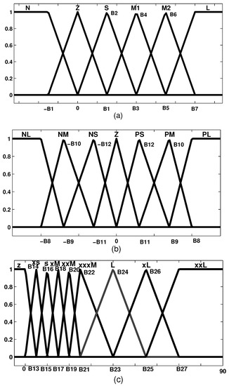 (a) Fuzzy membership functions for the pitch angle controller’s first input. (b) Fuzzy membership functions for the pitch angle controller’s second input. (c) Fuzzy membership functions for the pitch angle controller’s output.