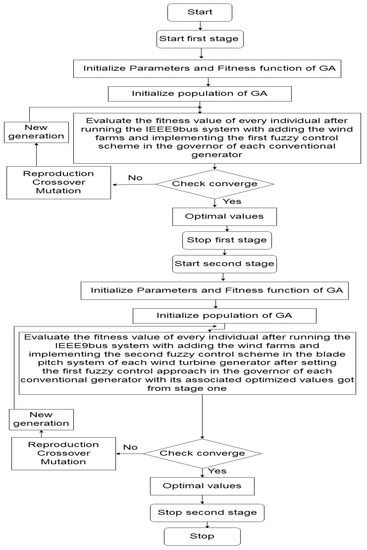 Following the usage of the GA, the optimal values for membership functions parameters acquired are then scored in Table 4. In Table 4, the unit of the input membership functions parameters (–) is pu.Mw. Meanwhile, the units of the output membership functions parameters (–) are in degrees. The flowchart of the complete design process for the proposed two GA-fuzzy based control schemes is presented in Figure 7.
