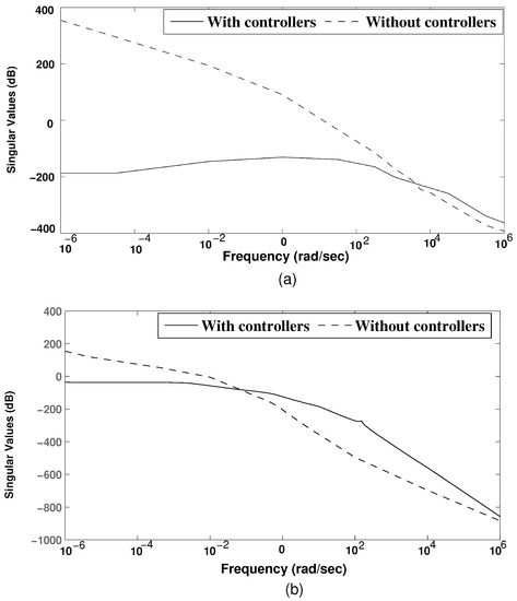 (a) Singular value plot of frequency control loop. (b) Singular value plot of the pitch angle control loop.