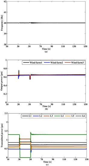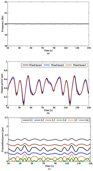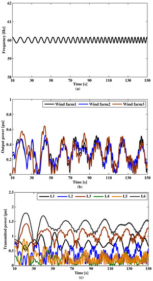No control approach is implemented for this case in the governor of the conventional generators or the pitch angle system of the WTG. Figure 10 shows the system frequency, generated output power of wind farms, and transmitted power in transmission lines, respectively. The results clearly indicate the instability of the power system represented in frequency oscillations. Also, there are significant fluctuations in the output power of each wind farm, which leads to transmitted power variation for all transmission lines.