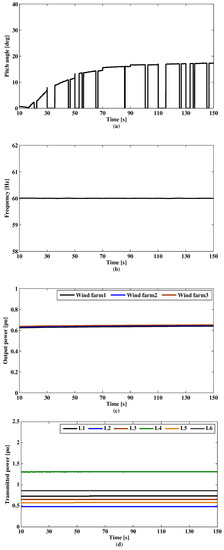 Case 3 result. (a) Pitch angle. (b) System frequency. (c) Generated output power of wind farms. (d) Transmitted power.
