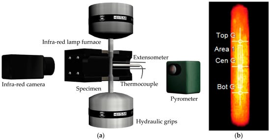 (a) Schematic representation of the bespoke thermo-mechanical fatigue test setup tailored specifically for non-metallic materials utilising thermography; (b) Example overview of thermography view of test specimen temperatures.