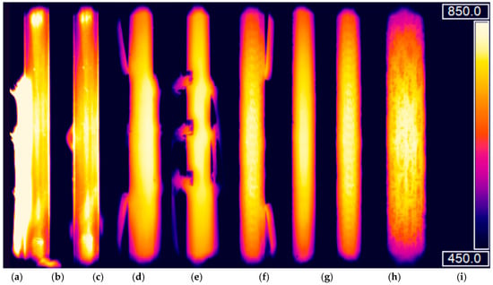 Clear hot spots exist beneath the point of contact of the tie-on TC, the insulating effect is magnified by spot welded thermocouples aligned along the specimen’s surface, Figure 8c. The effect exists upon both metallic and non-metallic materials, Figure 8d,e respectively. Specimens imaged without attached thermocouples show no distortion or hot spots and a well distributed, uniform thermal path exists, Figure 8f–h.