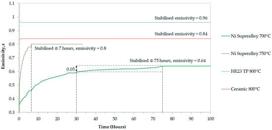 In Figure 9, it shows that surface emissivity of the Ni alloy at a constant temperature of 700 °C does not stabilise until after 75 h, with a resultant stabilised emissivity value of 0.64. At 750 °C the rate of oxidation is higher and hence the rate of emissivity evolution is rapid with time at temperature. The surface emissivity stabilises after just 7 h at 0.8, an increase of 0.16 compared to the stabilised emissivity value at 700 °C. Consistent with previous work, the emissivity of the HE23 TP is stable; the emissivity was stable at, ε = 0.96, for the duration of testing. Stability of the CMC surface was also stable for the duration of testing with an emission value of 0.84.
