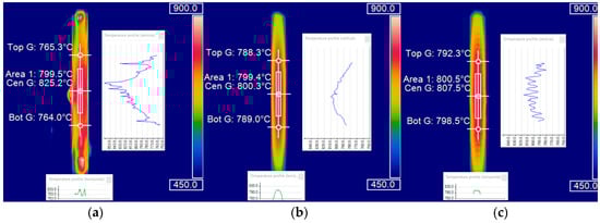 Temperature ranges and modes can be tailored to suit the current objective of the operator, allowing extensive examination of temperature paths and gradients. An example of the comprehensive analysis possible is given in Figure 16. Single point measurements across the specimen gauge section are tracked and recorded in Figure 16a, temperature range is relative to the thermal cycle employed, 800–550 °C. A more detailed examination of the specimen at the peak cycle temperature of 800 °C, is shown in Figure 16b. The temperature range has been narrowed to reveal the complex hot and cold spots across a complex ceramic woven structure. Vertical, y-axis and horizontal x-axis temperature paths are recorded.