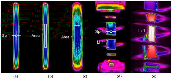 Size and location of possible measurement points and areas employed during the thermography control method. (a) Single point control; (b,c) Average area control through a furnace window; (d) Single point control; (d,e) Average line control possible through induction coil designs.