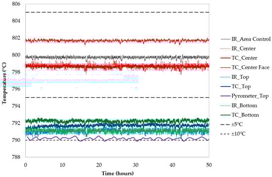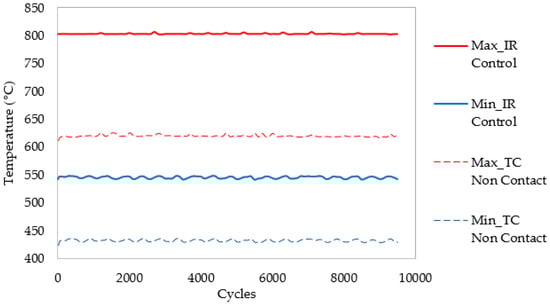 A significant advantage of thermography is its ability to measure non-metallic materials during dynamic thermal cycling when thermocouples cannot be spot welded to the non-conductive ceramic material and the stability of a pyrometer is not accurate enough under RLF heating. As such a non-contact thermocouple was installed to capture a secondary measurement of long term peak cycle temperatures. Results of the peak cycle temperatures of both the thermography area control and the non-contact TC are given in Figure 15. Thermal testing ran for over 10,000 cycles, equivalent to 270 h. No drift in peak cycle temperatures was found in either the thermography area control or non-contact monitoring TC.