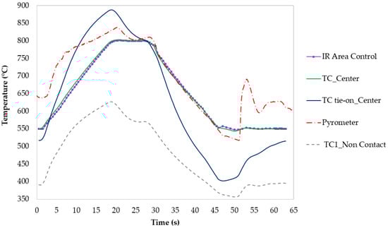 The previously described method of was applied dynamic thermal cycles in the form of a trapezoidal dwell waveform, more commonly described as a flight cycle in the gas turbine sector. Thermal waveforms were undertaken using both ICS and RLF heating sources over a 550–800 °C temperature range. Temperatures were monitored by spot welded, tie-on and non-contact thermocouples, as well as, a pyrometer at centre of the test piece gauge section. Typical responses from each of the techniques under RLF heating are shown in Figure 13.