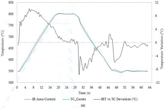 This behaviour was noted in previous work [], the small mass of the thermocouples gives rise to rapid temperature changes. Thermocouples appear to absorb heat energy during heating stages of the cycle and shed heat during the cooling stage. This gives rise to different ramp rates and, directly compared to thermography, inaccurate temperature readings. This effect also seems to appear on closer inspection of the symmetry between readings from thermography control and the spot-welded thermocouple, during the heating and cooling stages of dynamic cycles, Figure 14. Accuracy then recovers to within ±2 °C during isothermal stages of the cycle, again consistent with previous work, [,].