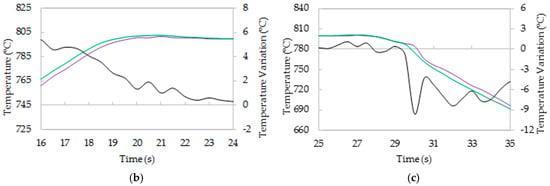 A more detailed comparison of the temperature deviation between the thermography area control and monitoring spot welded TC during dynamic thermal cycling is given in Figure 14a. Typically thermocouples measure within ±2 °C of the thermography area control for all tests during isothermal or constant temperature portions of the cycles. However, significant temperature differences up to 10 °C were found during heating and cooling turning points of the dynamic thermal cycles, Figure 14b,c. During the isothermal dwell stages of the waveform accuracy returned to within ±2 °C.