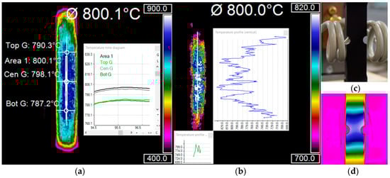 Overview of the additional scope and visibility of temperatures thermography can provide. (a) Temperature range is relative to the employed 550–800 °C thermal cycle, single point and area measurements are recorded, through a time/temperature plot; (b) Reduced temperature range to uncover intricate temperature maps across the complex ceramic composite material (CMC) structure at the peak cycle temperature, 800 °C. Line temperature profiles along the specimen X and Y-axis are displayed; (c) Double notched specimen coated with HE23 TP within a complex split transversal electromagnetic field helical induction coil; (d) Non-uniform temperature distribution is clearly visible using thermography across a double notched specimen coated with HE23 TP within a complex split transversal electromagnetic field helical induction coil given in Figure 16c.