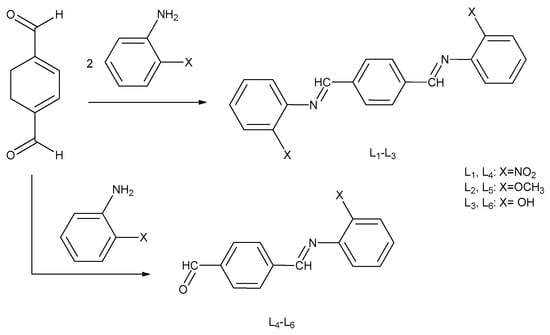 Condensation reaction of Terephthalaldehyde with o-nitroaniline, o-Anisidine and 2-aminophenol in molar ratio 1:1 and 1:2 afforded the corresponding Schiff base ligands as described below: