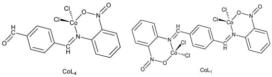 Complex [Co2(1,4-phenylenebis(methanylylidene))bis(2-nitroaniline)Cl4] (CoL1): Pale Green solid. Yield: 84%. M.P. 248–250 °C. Molar conductivity (Ω−1 mol−1 cm2): 22. Selected IR data (ν, cm−1): 3109, 2971, 1651, 1521, 1384, 598, 492. UV-Vis (DMSO): λmax (nm) = 300, 410, 600,690. Mass (see Supplementary Materials): [m/z]+ = 633.