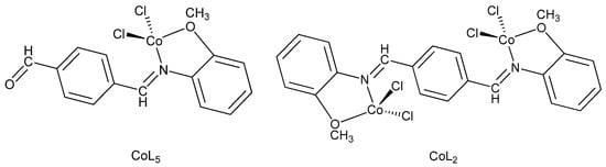 Complex [Co(4-(((2-methoxyphenyl)imino)methyl)benzaldehyde)Cl2] (CoL5): Orange-Red solid. Yield: 82%. M.P. 305–307 °C. Molar conductivity (Ω−1 mol−1 cm2): 16. Selected IR data (ν, cm−1): 3100, 2900, 1619, 568, 509. UV-Vis (DMSO): λmax (nm) = 290, 370, 600, 670. Mass: [m/z]+ = 473.