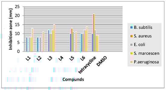 From Figure 5 it can be observed that the L3 and L6 with OH group had relatively higher antibacterial activity compared to the other ligands tested against the bacteria strains. These ligands had better inhibitory effect against Pseudomonas aeruginosa with diameter inhibition zone of 15 and 14 mm, respectively. In contrast, the L4 with one NO2 group showed no antibacterial activity against tested bacteria strains.