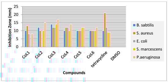 Graphical presentation of antibacterial activity of ligands against bacterial strains, measuring the inhibition zone (mm). DMSO: dimethyl sulfoxide.