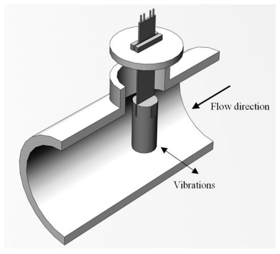 The device investigated in the current work is based on the study of Cottone et al. [] and consists of a piezoelectric beam assembled to an oscillating body, a circular cylinder of diameter D = 0.01 m, inside the water of pipes from 0.0508 to 0.1270 m of diameter, see Figure 1.