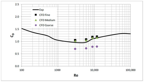 A mesh independency study has been carried out to verify sufficient mesh resolution. To that end, the Richardson extrapolation method has been applied to the drag coefficient calculations. Figure 4 shows the comparison between the experimental data of Roshko [] and the current CFD results of CD with three different meshes: 14,000 (coarse), 28,000 (medium), and 56,000 (fine) cells.