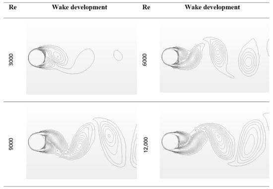 The vortex shedding is visualized by means of the contours of stream function vorticity. Figure 5 shows the vorticity contour lines for Re = 3000, 6000, 9000, and 12,000 cases at the time of 20 s. The alternating formation, convection, and diffusion of the vortices can be clearly observed.