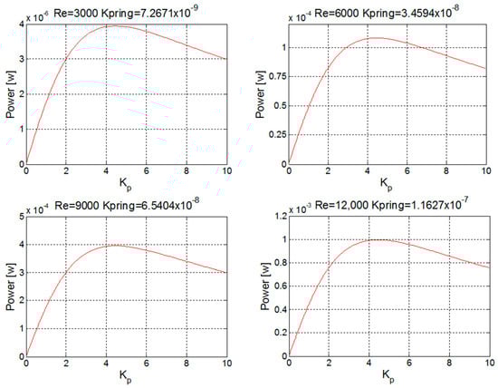 After applying the optimization algorithm to the control system, we have obtained the following results. Figure 9 illustrates the curve of the extracted power from the energy harvester versus the proportional gain of the control law, for each Reynolds number. The optimal value of the spring constant, , for each case is also denoted. It is clearly visible in each plot that a maximum power is achieved in the range of examined . The maximum extracted power at the lowest Reynolds number, Re = 3000, is 3.95 µW which corresponds to a water velocity of Vwater = 0.34 m/s. At the maximum Reynolds number, Re = 12,000 with a Vwater = 1.36 m/s, the power is much larger reaching the value of 996.25 µW. For the intermediate water velocities of Vwater = 0.68 m/s and Vwater = 1.02 m/s corresponding to the Re = 6000 and Re = 9000, respectively, the mean power extracted is also considerable. The largest leap in the power is achieved in the range from Re = 3000 to Re = 9000 where the power is multiplied by almost 10 times. Table 4 represents the values of the extracted power for all water velocity cases and their corresponding optimal values of the spring constant and proportional gain of the control law .