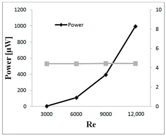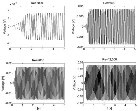 The variation of the output voltage at different Reynolds numbers is shown in Figure 10. Note that Figure 10 represents the transient state from the initial state t = 0 s and only up to 5 s for better illustration of the wave form progress. It could be found that the output voltage of the piezoelectric vibrator increases as the Reynolds number increases. As expected, the maximum value of voltage is achieved by the case with the largest fluid velocity which corresponds to the case Re = 12,000.