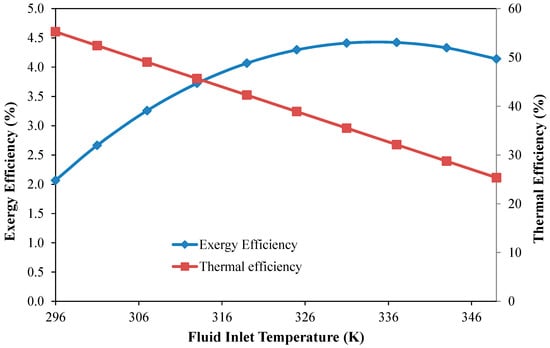 Variation of exergetic efficiency and thermal efficiency with fluid inlet temperature.