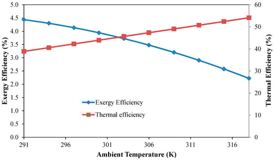 Variation of exergetic efficiency and thermal efficiency with ambient temperature.