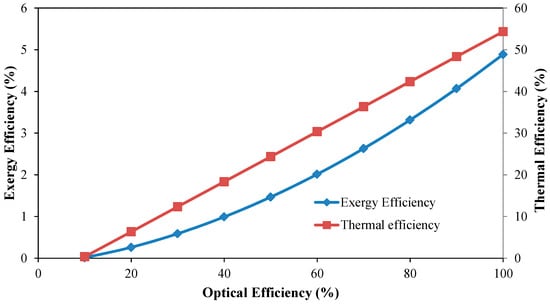 Variation of exergetic efficiency and thermal efficiency with optical efficiency.