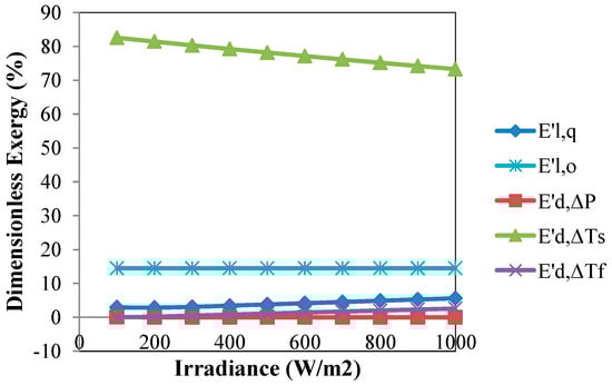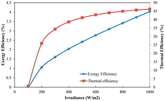 Variation of exergetic efficiency and thermal efficiency with irradiance.