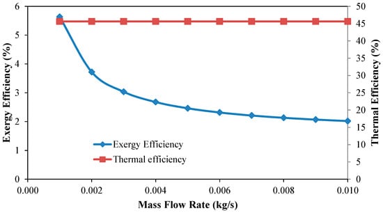Variation of exergetic efficiency and thermal efficiency with mass flow rate.