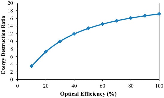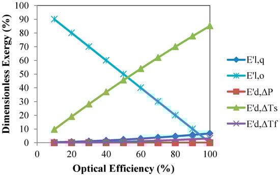 Optical losses reduce as the optical efficiency increases, hence the thermal and exergy efficiency increases (Figure 6). Increasing optical efficiency from 0% to 100% increases the exergy efficiency from 0% to 4.9%.For FPC, it was reported that the exergy efficiency increases with optical efficiency in similar manner [14].
