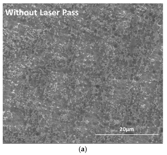 Higher magnification imaging of Zone 1 in the Zr region with one laser pass showed the spherical to equiaxed grained microstructure of Zr after LENSTM processing, as seen in Figure 2b. In the sample with one laser pass, the grain size remained unchanged and was 0.66 ± 0.07 µm. On top of these grains, some secondary phases were also seen. The lowermost zone immediately above the Ti6Al4V interface was also similar for both the sample. Hence, the laser scan on the surface after LENS™ deposition effectively created the extra zone. It created the Zone 1 (in Figure 2b) and the depth of this zone could be indicative of the effective depth of the laser remelting process. Figure 2c,d show the embedded phase that was found to be more prominent in the samples after laser pass. These particles shows a high contrast, irregular structure (Figure 2c), but had a smooth transition with the equiaxed phase around them (Figure 2d). Compared to the LENS™-processed samples without any laser pass, the secondary phase appeared to be less distributed and more agglomerated; the phase was larger in size and not as widely spread for laser pass samples. These differences can be seen in Figure 3a,b.