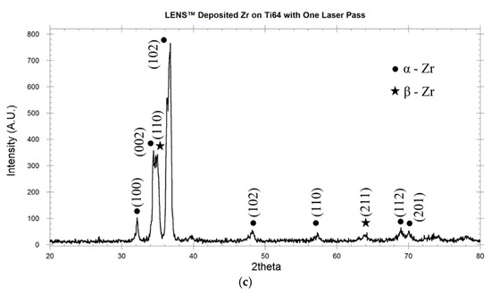 Figure 4a shows the phase analysis from the XRD data of the feedstock Zr powder. The feedstock powder prior to processing was found to contain only a single phase of Zr; only α phase was detected. Figure 4b,c show the results of the same for LENSTM-processed Zr on Ti6Al4V without and with a single laser pass, respectively. In both the cases, retention of α phase, hcp structure, of zirconium was prominent. Along with the α phase, the β phase with bcc structure was also noticed. From the Joint Committee on Powder Diffraction Standards (JCPDS) indexing file, the α (hcp) phase has lattice parameters of a = 3.232 Å, c = 5.147 Å, while the β (bcc) phase has lattice parameter of a = 3.5453 Å.