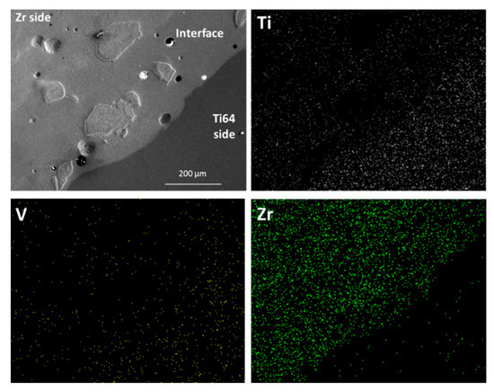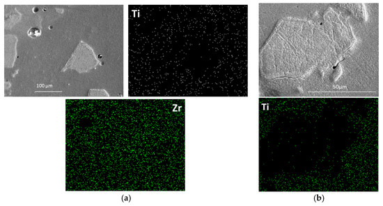 Ti from the Ti6Al4V alloy substrate was found to dilute along the interface into the Zr interface region more than Zr. Vanadium from the Ti6Al4V alloy substrate was hardly detected on either side, while Al was detected even less due to its comparatively lower atomic weight. In the SEM images in Figure 5, large particles appear to be embedded in the interface region. These particles were observed in all the samples, irrespective of the post-deposition laser pass on the surface. Figure 6a,b show the EDS elemental mapping of one such particle in the interface. The embedded particles appeared to be depleted in Ti and rich in Zr, as seen in Figure 6a. Even the particle that was very close to the Ti6Al4V alloy substrate, in Figure 6b, was depleted in Ti.