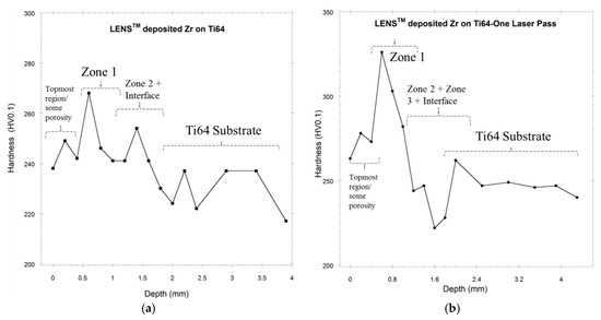 Hardness depth profile of LENS™-deposited Zr on the Ti6Al4V (Ti64) alloy: (a) no laser pass; (b) with one laser pass.