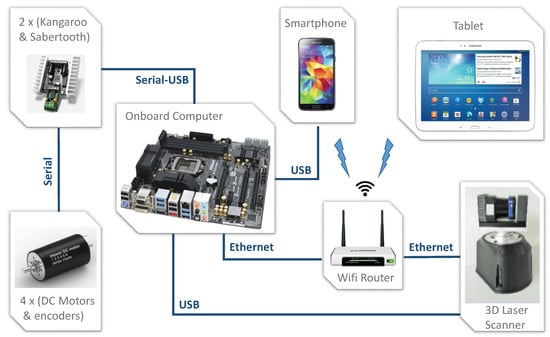 The chassis of the robot has three levels: bottom for the motors and the battery, middle for electronics and the computer, and top for sensors and a WiFi router (see Figure 1). The computer has an Intel Core processor i7 4771 (four cores, , 8 MB cache) and 16 GB RAM. A tablet is used for remote supervision and teleoperation of the robot via the onboard WiFi router (see Figure 2). Andabata has a smartphone to obtain data from its GPS (with a horizontal resolution of 10 ), inclinometers, gyroscopes, magnetometers and its camera.