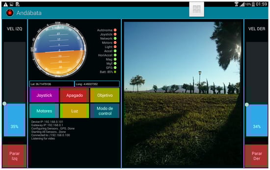 Andabata can be teleoperated by a person through an Android app in the tablet called Andabata, which is an adaptation of the Mover-bot app [30] that runs both on the tablet and the onboard smartphone. The application on the tablet has two sliders for both hands to indicate the speed of the left and right treads, which are sent through the local WiFi network to the Andabata app on the smartphone (see Figure 3). Video feedback, GPS position, and robot inclination is provided by the smartphone to the tablet via WiFi. Another app on the smartphone, called Android_sensors_driver, publishes a ROS topic directly on the computer with all the sensory data of the smartphone via WiFi [31].