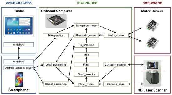 Figure 4 shows a general scheme of the ROS nodes employed by Andabata. The Navigation_mode node selects tread commands from teleoperation or from autonomous navigation, which are sent to the motor drivers through the Motor_control node. During teleoperation, the Andabata app on the smartphone retransmits the speed commands from the tablet to the Teleoperation node via USB. The rest of ROS nodes are explained in the following sections.
