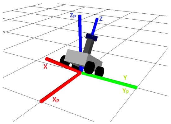 Let be the reference system associated with the robot, which is located at the geometric center of the rectangle defined by the contact points of the wheels with the ground. The X-axis coincides with the longitudinal axis of the vehicle pointing forwards, the Z-axis is normal to the support plane and points upwards and the Y-axis completes this orthogonal coordinate system pointing to the left (see Figure 5). The Cartesian coordinates for a leveled 3D point cloud are expressed in an reference system whose origin coincides with that of the vehicle at the beginning of each scan. The axis coincides with the projection of X on the horizontal plane, and is defined with the same direction as gravity and opposite direction (see Figure 5).