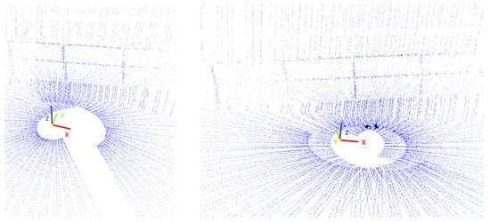 With Andabata stopped, a 180 horizontal turn of the head of the 3D scanner is enough to capture all the surroundings of the robot, but, with the vehicle in motion, it is necessary to perform a full 360 turn. In this way, non-sampled areas around the robot are avoided and the blind zone above the robot is reduced (see Figure 6).