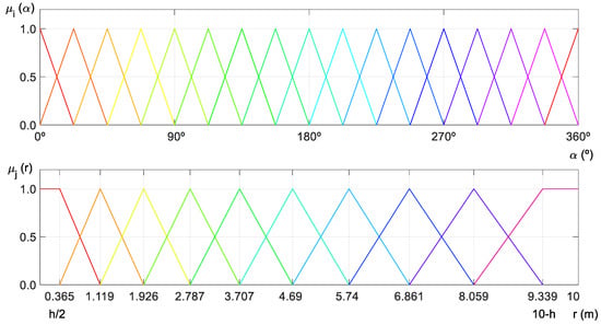 A total of sixteen fuzzy sets for have been defined evenly-distributed over (see Figure 9). In this case, triangular membership functions for are defined as: