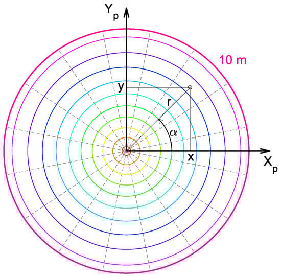 It is assumed that the ground surface around the robot can be represented as a continuous function , where the angle and the distance describe the projection of a 3D point on the plane. Similarly, an FRM is defined as a continuous function , where values of v close to one and zero, represent the maximum and minimum reliability values for the FEM, respectively. The FEM and FRM are defined in the universe for variable , and for r, which corresponds to a circle centered at the origin of .